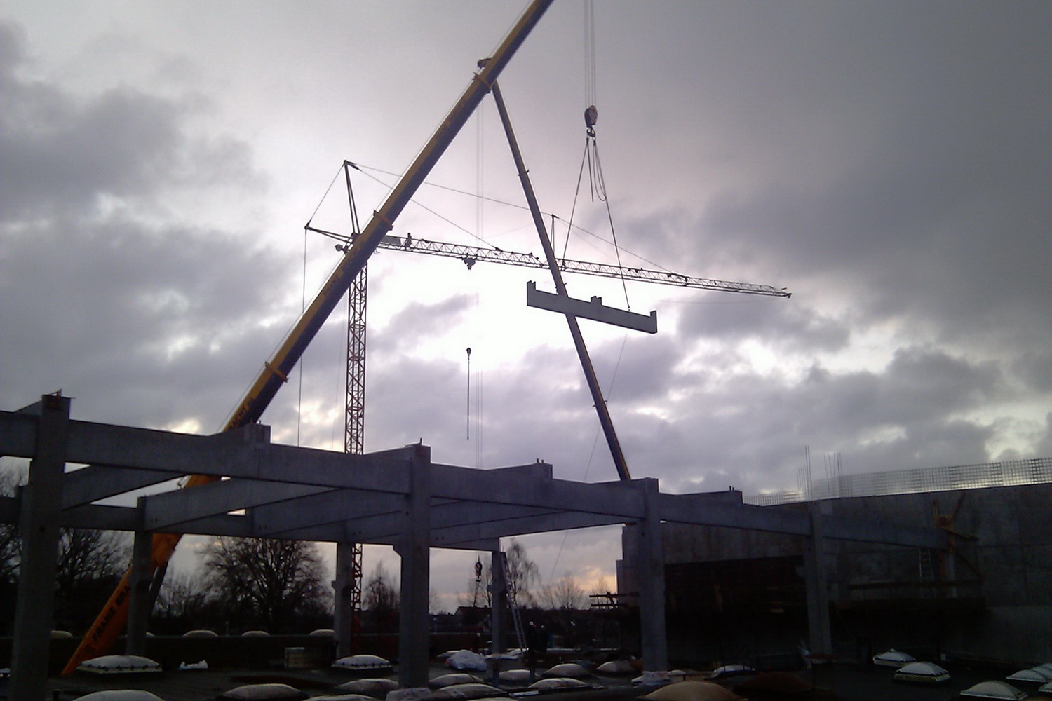 Das Gebäude wurde über einer Halle zwischen dem Bürogebäude und der Produktionshalle errichtet und erschlossen.